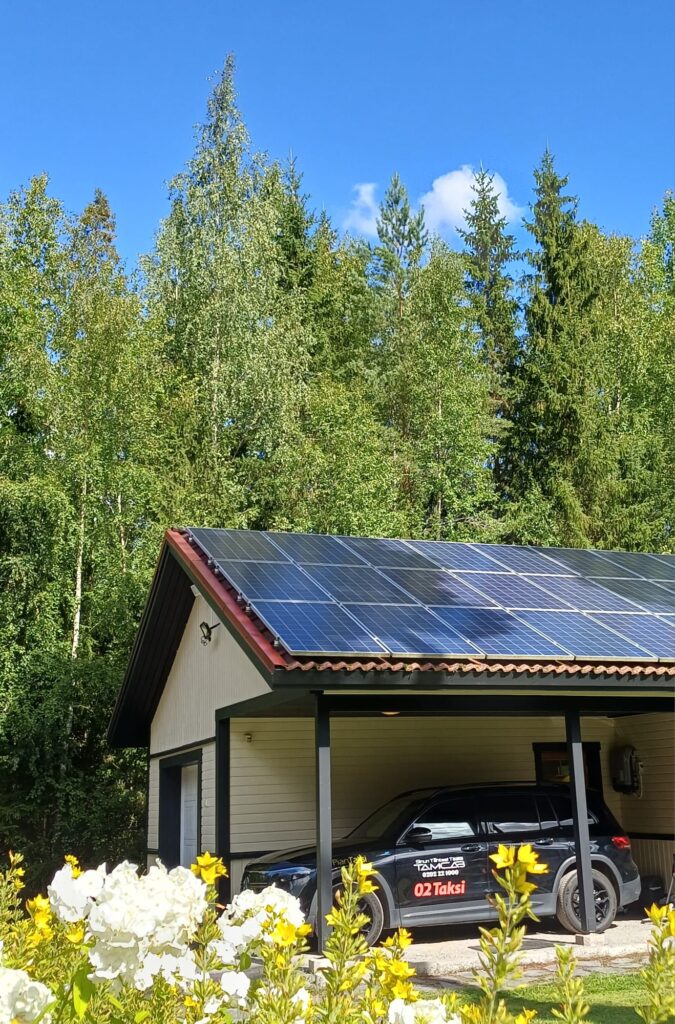 Automme kulkee puhtaasti sähköllä. Puhtauden puolesta puhuu myös autotallin katolle asennettu aurinkovoimala.